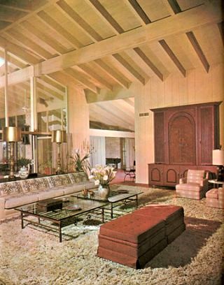 The above 1960’s retro interior shows how it all works. Note how the lighter pinks in the floral arrangements, sofa and chairs gently duplicate one another. In contrast, the darker coloring of the ottomans balance the weight of the hutch. The glass coffee tables are a spot on complement to the windows behind the sofa. They not only create unity, but they also lend a modern flair to the ambiance;as do the pairing of the gold lamps and the coffee tables. Can you see how rhythm makes the room dance?